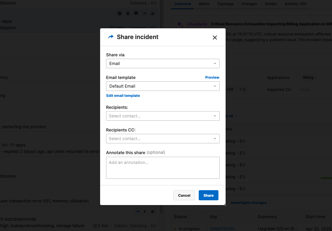 To & CC: Add the email address(es) that should receive shares to this template. Use plain text, BigPanda Contact IDs, or a combination of both. All addresses will be automatically added to manual and AutoShares using this template.